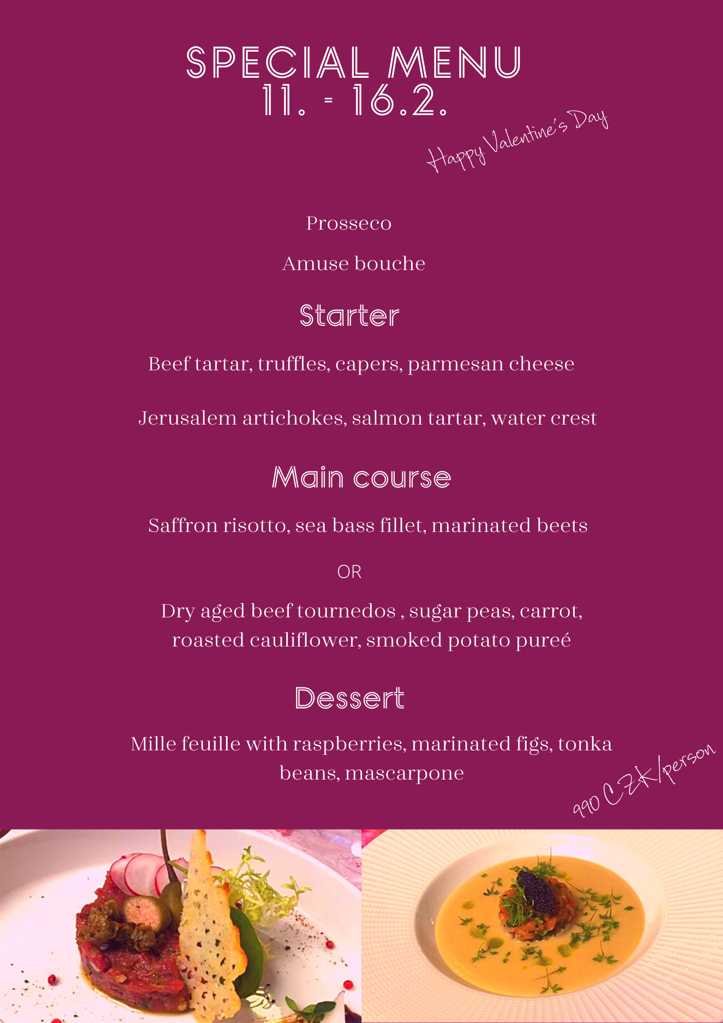 Whether you are in love or not, come to Bull & Bonito from Friday 11th to Wednesday 16th February for a special 4-course menu prepared by chef Jan Schánil. What can you look forward to? As a main course you can have either saffron risotto with sea bass fillet and marinated beets or tournedos of ripe sirloin, sugar peas, carrots, roasted cauliflower and smoked mashed potatoes.